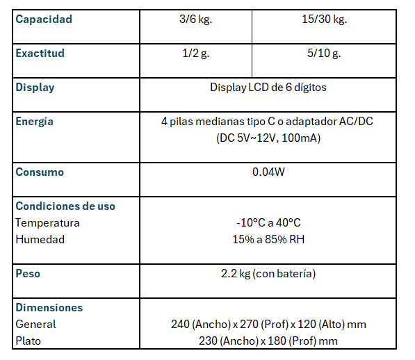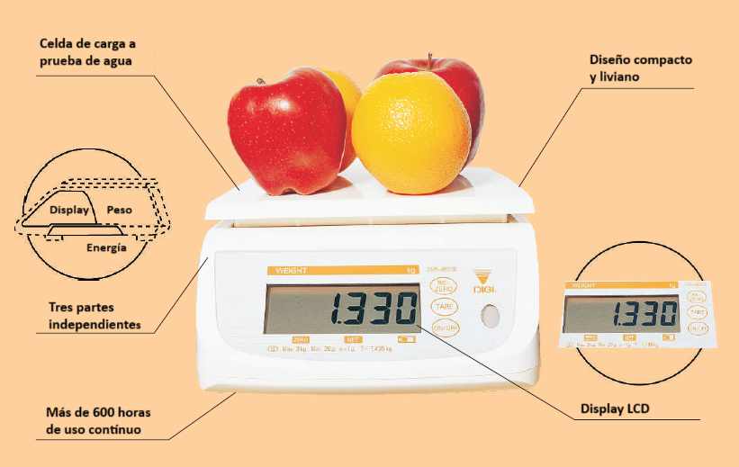 ¡En cualquier momento, en cualquier momento! ¡Pesaje rápido y preciso garantizado!Balanza a prueba de agua La DS-500 es una balanza portátil con un diseño compacto.Permite a los usuarios medir pesos de productos en un rango de 1 g a 30 kg. Sus tres partes independientes la hacen completamente a prueba de agua. Doble almentanción eléctrica Use la DS-500 con un adaptador AC (incluído) o con pilas medianas comunes (tipo C) dependiendo del uso. Cuatro pilas alcalinas permiten su operación durante 600 horas y un indicador le informa cuando cambiar las pilas. Gran tamaño del display El panel LCD es grande y está ubicado en un ángulo que a simple vista proporciona una lectura instantánea del peso, para prevenir los errores de lectura. Especificaciones
