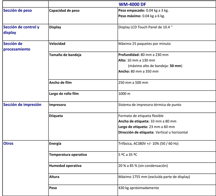 Pantalla LCD táctil a color de 10.4 pulgadas Una operación simple y confiable es asegurada con la gran pantalla LCD táctil a color de 10.4 pulgadas, combinada con un teclado numérico fácil de usar. Variada información de producto puede ser mostrada, tales como lugar de origen o la temperatura de almacenaje. Una operación simplificada provee mensajes de ayuda para asistir a los operadores de todo nivel de experiencia. Empaquetado flexible Con el dispositivo original de envoltura de Ishida, la WM-4000 DF puede envolver bandejas de diferentes formas. La carga servo-controlada de la bandeja mantiene la envoltura hermosa y evita derramar el contenido. ![]() Cubierta de seguridad para la unidad de descarga Con el fin de proteger a los operadores de un accidente o lesión, los mecanismos y software han sido diseñados de acuerdo con nuestro concepto de garantía de la seguridad. La cubierta de seguridad está instalada en la unidad de descarga para impedir la inserción accidental de la mano o dedo. Formato versátil de etiqueta La WM-4000 DF no solo puede imprimir la etiqueta llamativa, sino también etiquetas con trazabilidad y otra información legal, tales como información nutricional. También esta disponible un modelo con impresora doble (opcional). Fácil carga de rollo de film Mediante el uso de un soporte deslizante para el film, el operador puede cambiar fácilmente el rollo de film desde el frente de la máquina. Por otra parte, la cubierta de rollo de film, garantiza la seguridad del funcionamiento y mantiene el rollo en buen estado, evitando la contaminación con polvo. ![]() Poca utilización de espacio El diseño compacto ahorra la utilización de espacio. La WM-4000 DF contribuye a la mejora de la eficiencia de la operación, inclusive en un pequeño lugar. Identificación y centrado automático de bandeja La cámara CCD identifica automáticamente la bandeja tan pronto como esta es colocada sobre de plato. Las condiciones de empacado y el peso de la tara son ajustados automáticamente y cualquier fluctuación en la posición de la bandeja del artículo es corregida por el centrador. Especificaciones