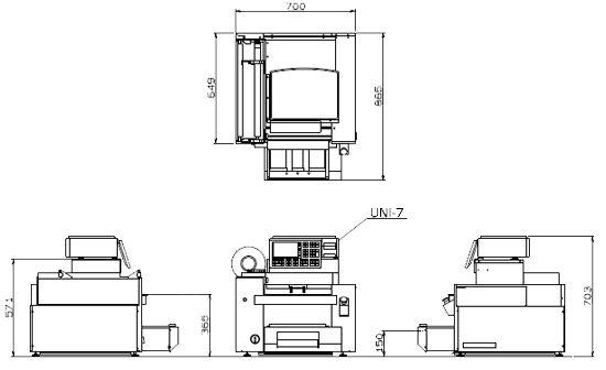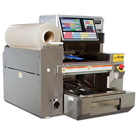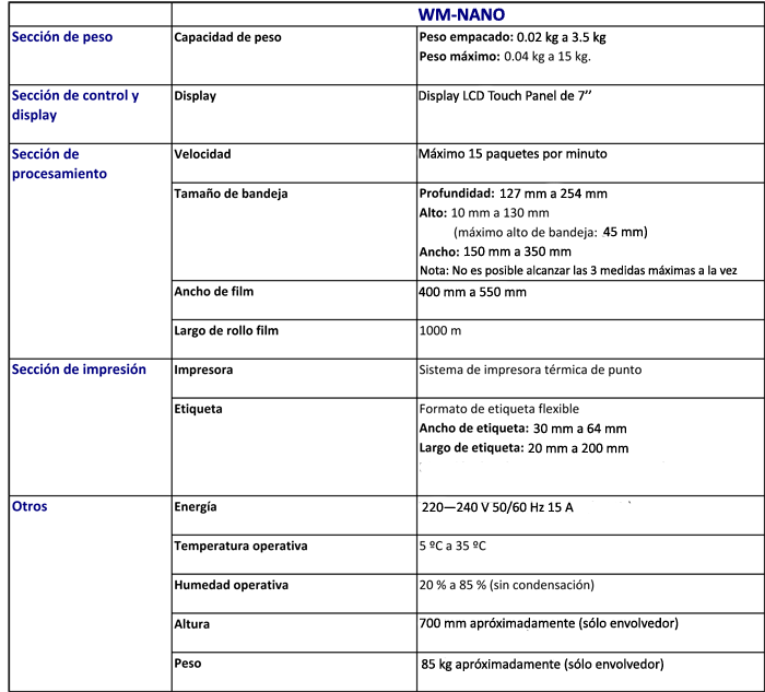 pero a un tamaño módico y un precio alcanzable.Ya no es necesario sacrificar área útil o hacer una enorme inversión para ganar más productividad. La WM-NANO aumenta su rendimiento a hasta 15 paquetes por minuto (PPM), mientras reduce el riesgo de lesiones por movimientos repetitivos frecuentemente causadas por el empaquetado a mano y logrando la misma envoltura atrayente en calidad cada vez, sin importar quién sea el operador. Por cortar las necesidades de espacio por 50 a 70 por ciento sobre modelos competidores, la WM-NANO cabe en casi cualquier lugar y acomoda un rango amplio de productos y tamaños de bandejas. Su diseño modular es fácil de instalar o desarmar. No se requiere ningún montacargas. Cuando es completamente ensamblada, la WM-NANO es ligera en peso y fácilmente transportable. Controlado por la báscula UNI-7 con impresora, la WM-NANO le proporciona la misma interfaz al operador que le que tiene un equipo de mostrador, no teniendo que aprender otra clase de equipo. La UNI-7 tiene una larga lista de sus propios beneficios, incluyendo el tener una pantalla personalizable a todo color sensible al tacto, cassettes de etiquetas rápidamente cambiables, comunicaciones Ethernet e inalámbricas. Pantalla LCD táctil a color de 7 pulgadas Una operación simple y confiable es asegurada con la gran pantalla LCD táctil a color de 7 pulgadas, combinada con un teclado numérico fácil de usar. Variada información de producto puede ser mostrada, tales como lugar de origen o la temperatura de almacenaje. Una operación simplificada provee mensajes de ayuda para asistir a los operadores de todo nivel de experiencia. Velocidad de producción de 15 paquetes por minuto Con esta velocidad de producción le permite poseer una de las mejores performances para máquinas de su tamaño. Carga y cambio de film muy sencilla La carga y cambio de rollo de film se realiza a través de un procedimiento muy sencillo y en pocos segundos.
